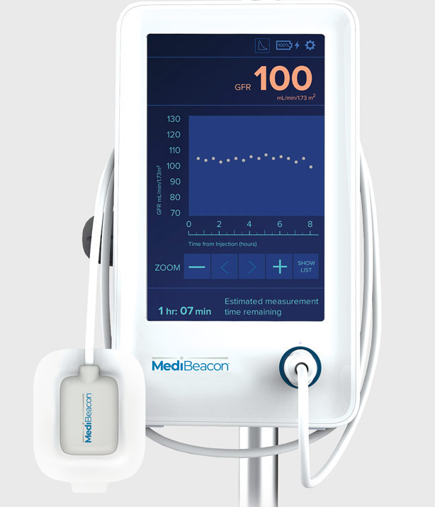 上述組件組合在一起來確定測量的腎絲球過濾率(GFR)值(mGFR)。經皮腎絲球過濾率(GFR)監測的目標是通過放置在患者皮膚上的經皮傳感器,提供一種對患者示踪劑水平隨時間變化的微創測量。從濾敏測R發射的螢光减少的速率被自動計算幷顯示在監視器上,從而産生連續測量的腎絲球過濾率(mGFR)。請觀看動畫。